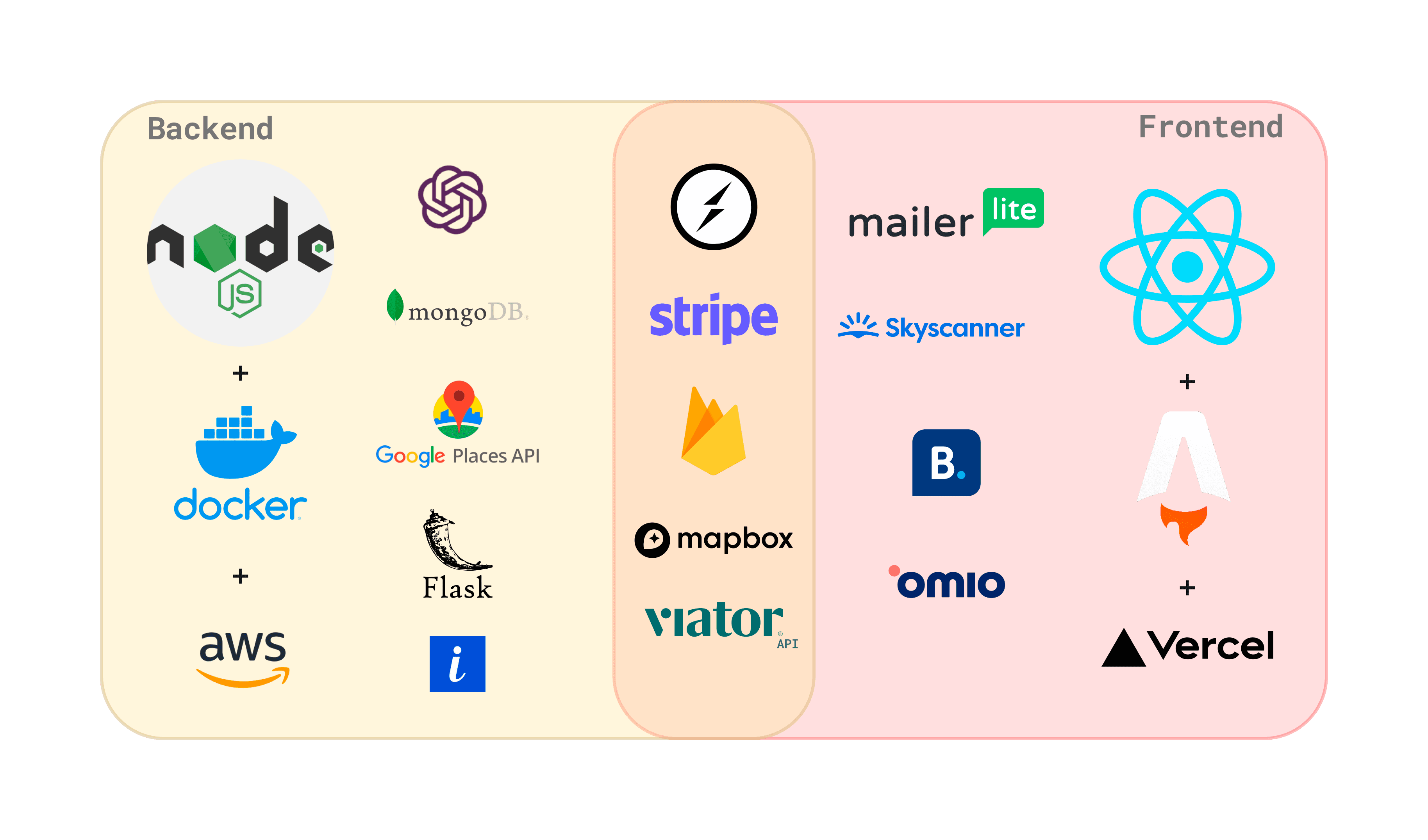 The backend and places service were containerized with Docker, deployed on AWS EC2, and served through Nginx as a reverse proxy. The system integrated OpenAI, Mapbox, Stripe, Firebase, and OAuth authentication.